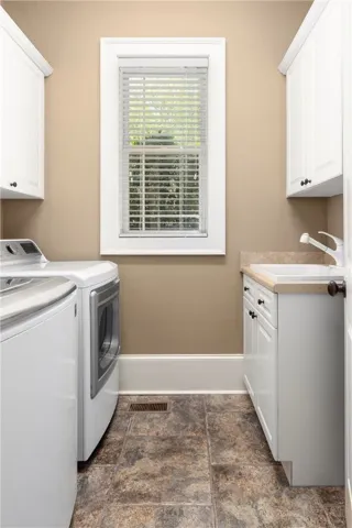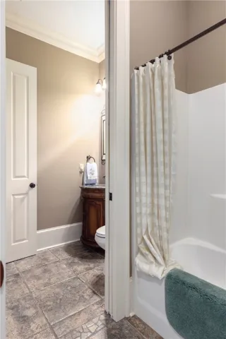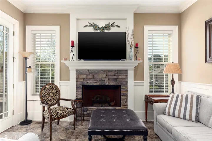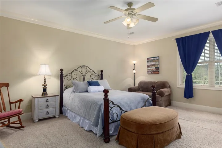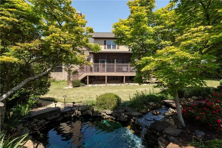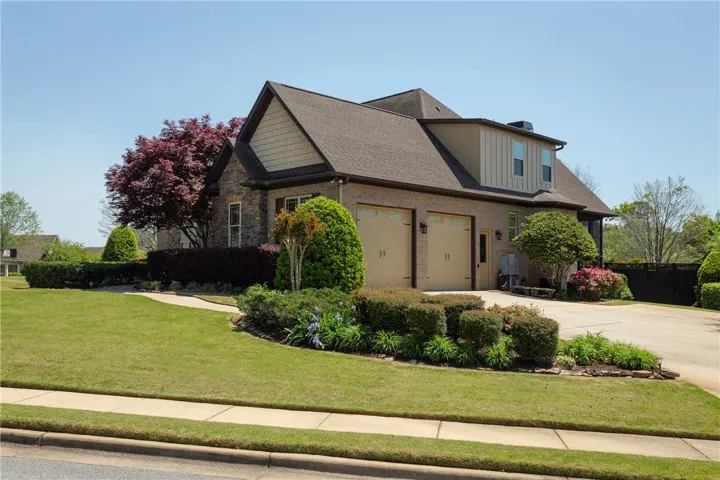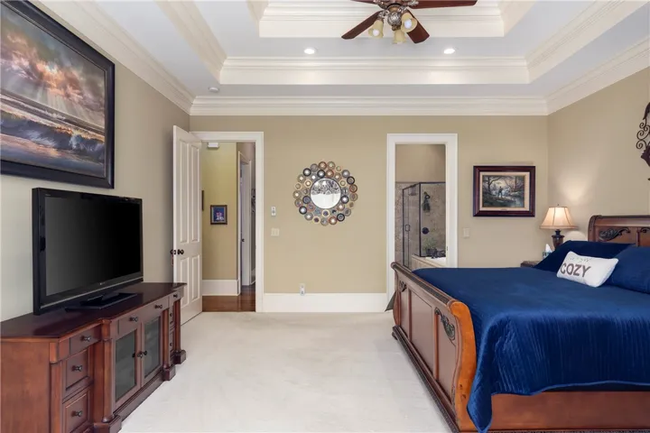 This beautiful custom built home by Bobby Cannon in Asheton Lakes has a wonderful layout that flows nicely for indoor/outdoor entertainment. It is nestled on .43 of an acre with stunning landscaping all around the home along with water features that are calming to listen to while spending time outside. The home boasts of 11 foot ceilings that are coffered, tray and vaulted designs throughout the formal dining room, living room, eat-in kitchen and two bedrooms on the main level. It has a mudroom and laundry room that are directly off of the entrance of the oversized two bay garage and a second laundry room upstairs for the three bedrooms that lead into one of the three walk-in attics. The private backyard has a privacy fence with a gate that opens right up to the green space that surrounds the beautiful and inviting neighborhood pool that makes for an easy transition to go to and from the home and pool.