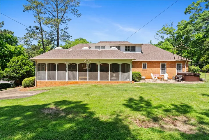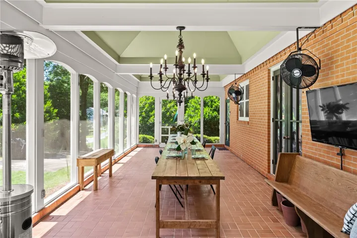 At the rear of the home, a screened porch with trey ceilings, skylights, and chandeliers invites you to embrace outdoor living in every season. Large enough for a banquet-length table and game-day lounging, it overlooks a lush lawn and stone patio made for lingering evenings—whether chasing fireflies, playing catch, or simply unwinding.