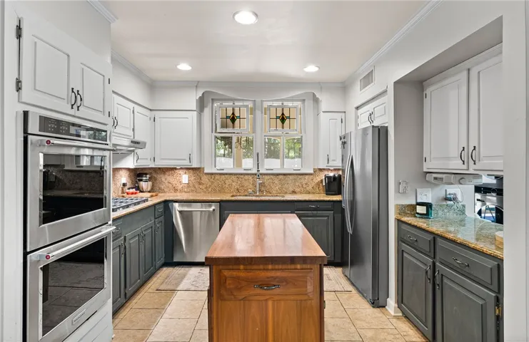 The expansive screened porch is impressive—truly the space everyone gravitates toward. Trey ceilings, skylights, and chandeliers set the scene for morning coffee, Sunday brunch, or cozy fall evenings. Generous in scale and rich with ambiance, this special space transitions seamlessly to a stone patio and lush lawn beyond—offering an outdoor setting that feels naturally inviting and easy to live in.