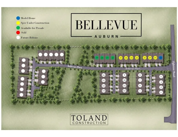 MOVE IN READY! Toland Construction is proud to introduce Bellevue, home to 43 luxury townhomes located in the heart of Moores Mill. Featuring the style and luxury you expect from Toland with the low maintenance lifestyle and convenient location you need! This home features 2 bedrooms, 2 bathrooms, and an office on the main floor and a 3rd bedroom and 3rd bathroom on the second floor. 10′ ceilings and hardwood floors throughout the main level, cabinets to the ceiling, butler’s pantry, cast stone fireplace, zero entry master shower, extended rear porch with a second fireplace outside…it’s all so so good. MUST SEE! 4′ aluminum fences are permitted, lawn care maintained as part of HOA. Social Membership Initiation Waiver included to the Moores Mill Club with purchase. *ASK ABOUT OUR EARLY BIRD INCENTIVES*