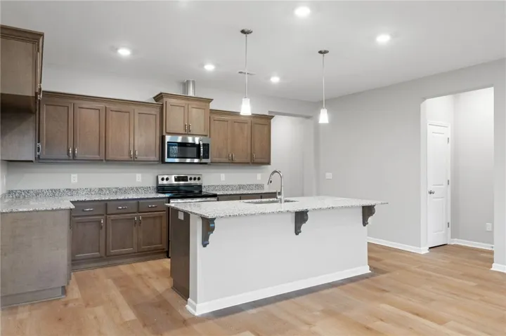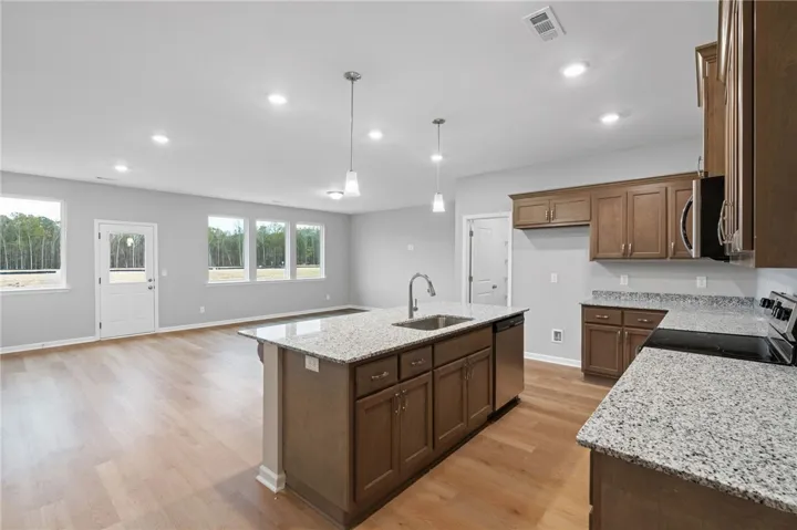 Introducing The Luna Farmhouse in the charming Anderson Lakes neighborhood! This 4-bedroom, 2-bathroom home offers 2,005 sq. ft. of thoughtfully designed living space, ensuring a lifestyle of comfort and convenience. Embrace the open-concept kitchen, dining, and living room, creating a spacious heart of the home perfect for gatherings. The kitchen stands out with quartz countertops and 42″ upper cabinets, premium LVP flooring, and sleek Frigidaire appliances, all beautifully illuminated by pendant lights over the island.