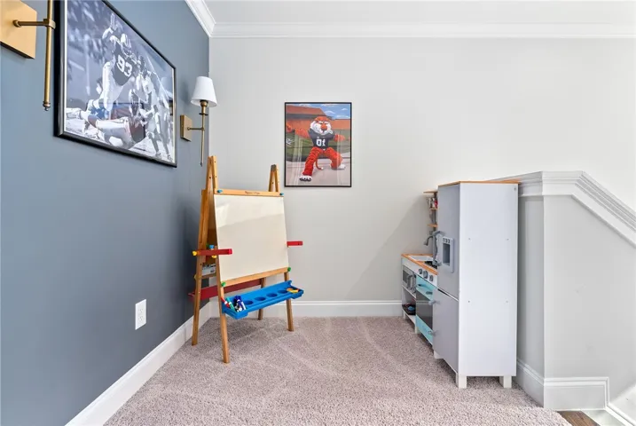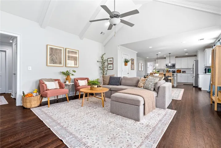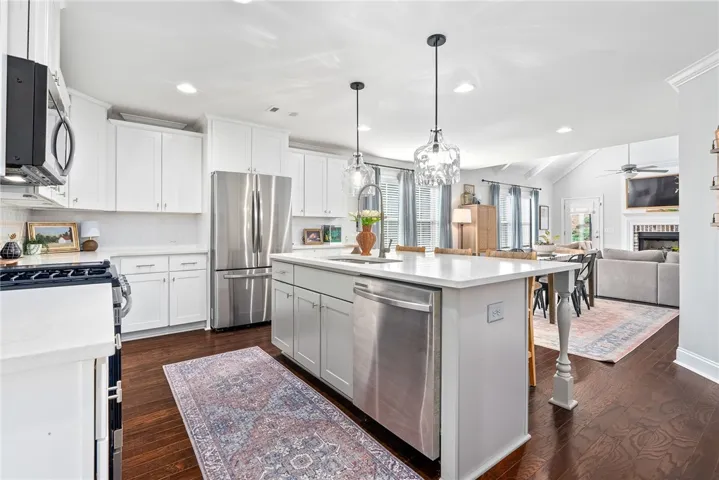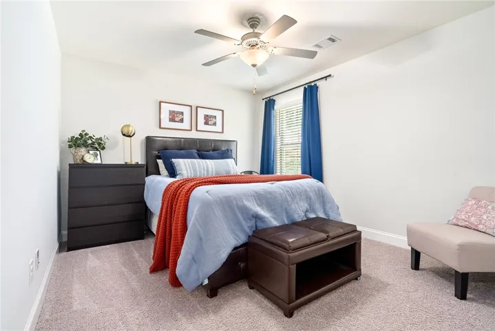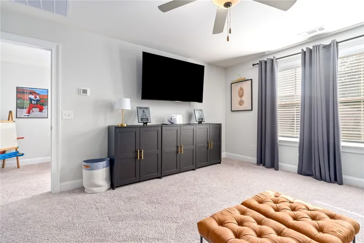 The heart of the home is the open kitchen, complete with granite countertops, a large island, pantry, and a cozy breakfast area that flows seamlessly into the great room—perfect for entertaining or relaxed everyday living. Just off the great room, you’ll find three additional bedrooms, each with generous closet space, connected by a hallway and a shared full bath with a double vanity.