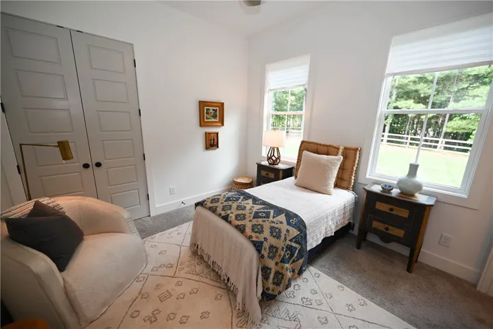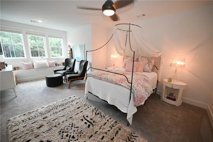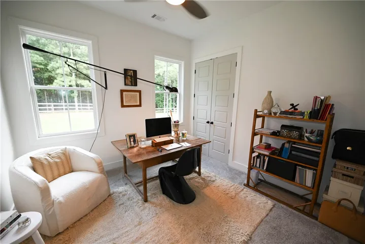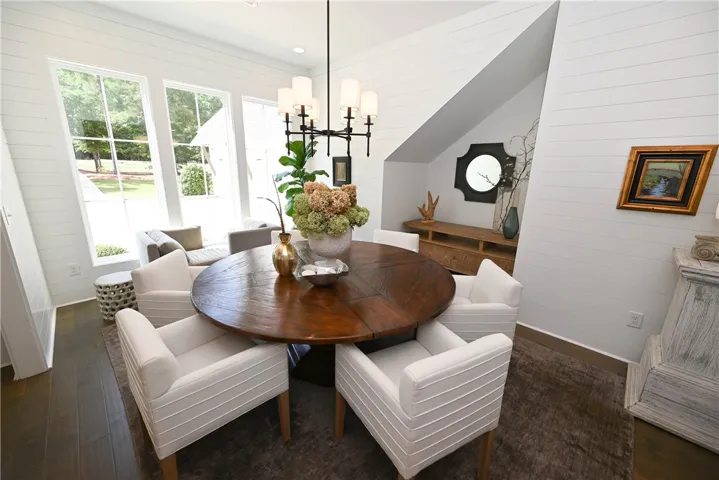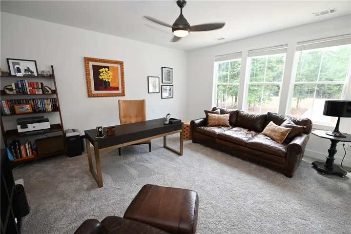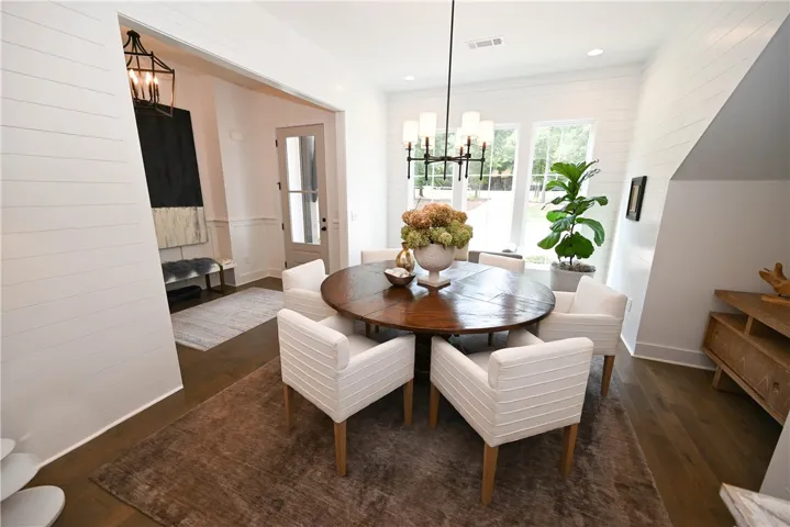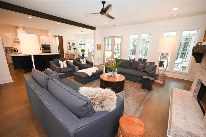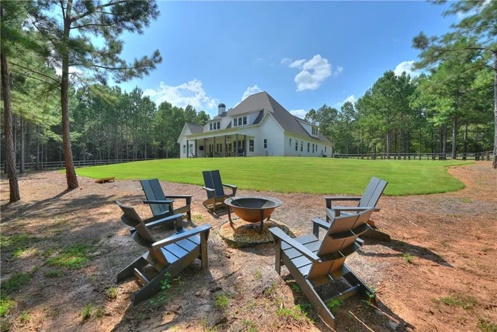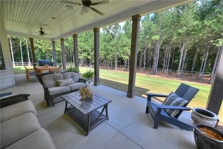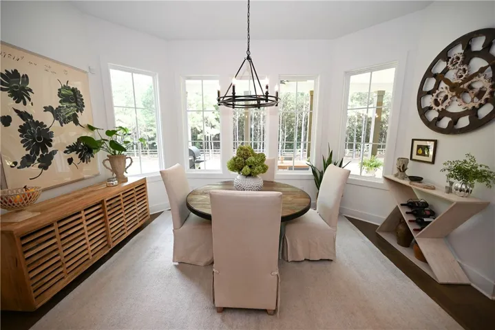 The open floor plan features 10-foot ceilings and dramatic windows spanning the length of the great room. A wood-burning fireplace anchors the space, creating a welcoming atmosphere for gatherings. Then step outside to the back porch to find the perfect spot for every season.