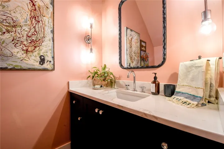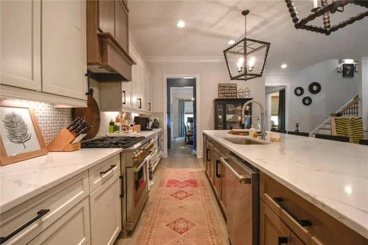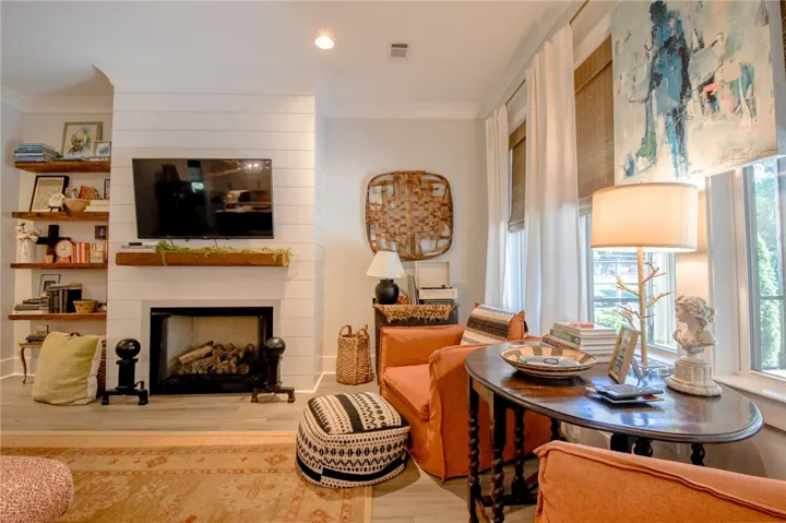 Moody Butler’s pantry w/beverage center + home management center (aka desk w/shelves for spirits/cookbooks). Gourmet kitchen featuring GE Monogram appliances – 6-burner gas range w/convection, ultra-quiet DW, built-in microwave & HUGE island w/seating for 6. Custom walk in pantry. Gas FP w/reclaimed wood mantle & built-ins add warmth & vintage charm.