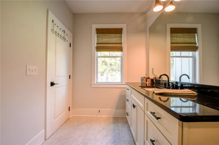 Main level primary suite has his/hers closets + luxe bath w/oversized shower & double vanities. Powder room for guests + screened porch for outdoor dining/grilling.