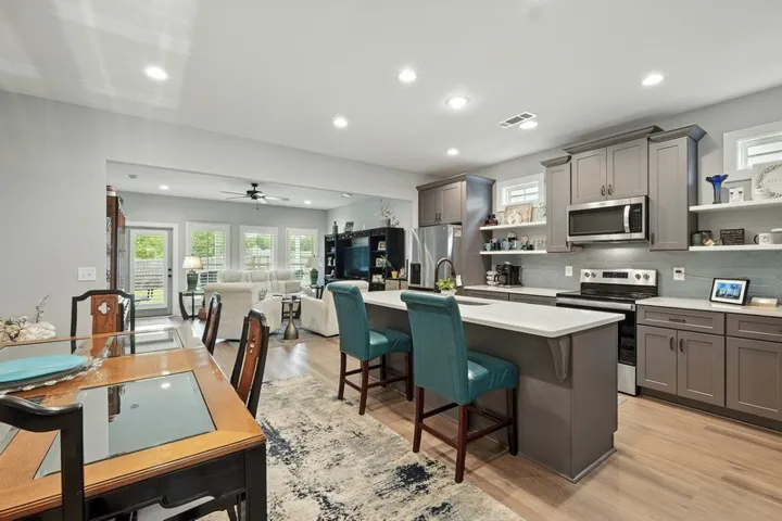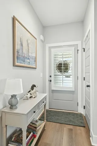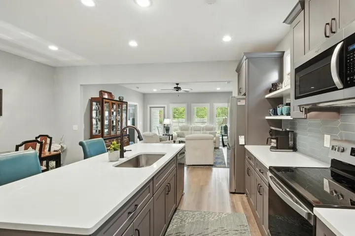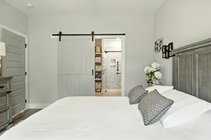 This beautifully designed 3-bedroom, 2-bath home offers 1,366 square feet of comfortable living space with designer features. Step through the front door into an inviting foyer, complete with a convenient coat closet to the left. Straight ahead, the foyer flows seamlessly into the dining room, while a hallway to the left leads to a guest bathroom and two well-appointed bedrooms. To the right of the dining area, you’ll find the kitchen featuring elegant Quartz countertops & kitchen island, tilled backsplash and stainless steel appliances—perfect for cooking and entertaining. Adjacent to the kitchen are the pantry, laundry area, and access to the attached one-car garage. The kitchen opens into a bright and inviting living room, which provides access to the covered back porch—ideal for relaxing or hosting guests. Off the living room, tucked away for privacy, is the spacious master bedroom with its own en-suite bath, a barn door entry and features a zero entry tiled shower, large walk in closet and linen closet with a barn door. Grab bars & 36″ door openings per ADA. Upgraded Luxury Vinyl Plank flooring throughout with NO carpet. $1,000 Attic flooring added above the garage for storage. $5,000 custom shades. $5,000 upgraded landscape & fence.There is a irrigation system. Back porch features $2,500 custom solar shades. Upgraded hardware throughout. Tile bathroom floors. Two barn doors. The video doorbell currently monitored by Chorus Security. The outdoor camera was installed at a cost of $250. Security system is the camera and the video doorbell. This home backs up to a well treed large area that cannot be developed plus it is on one of the larger lots in the development. All window treatments remain.Washer & dryer ($1100) to remain and Refridgerator remains.
