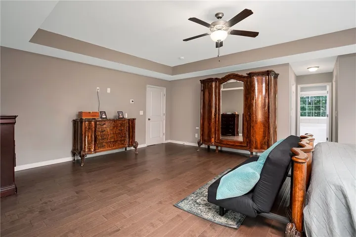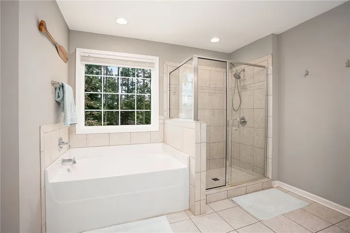 Upstairs, the huge primary suite is generously sized, featuring a tray ceiling, two walk-in closets, and a private bath with separate vanities, a soaking tub, and a tiled shower. The sitting area in the primary has potential for so many options – reading nook, baby’s nursery, office workspace. The three additional bedrooms are also large and provide flexible options for guest space, home office, or playroom.