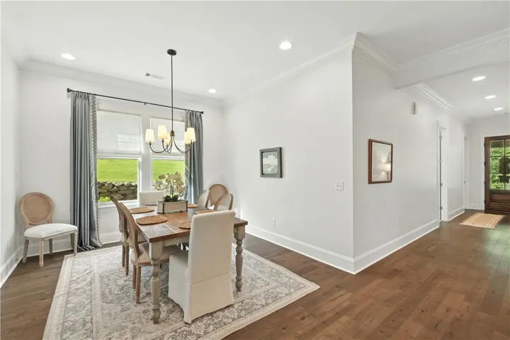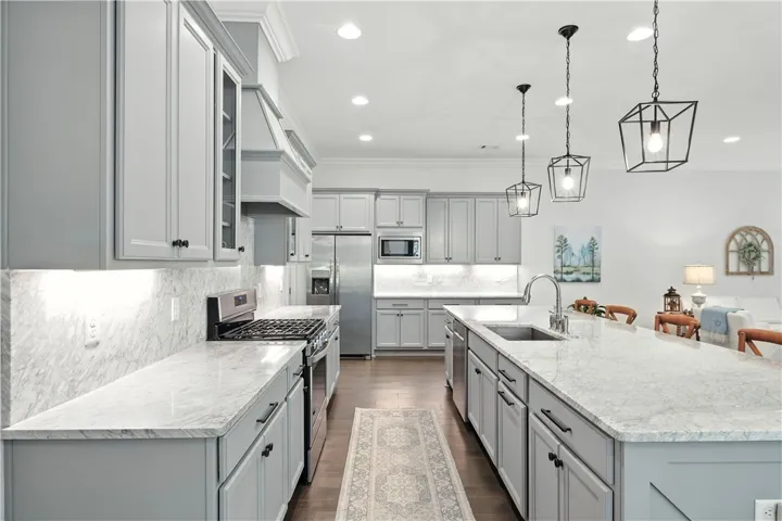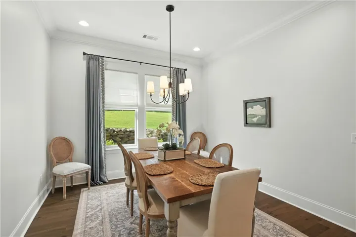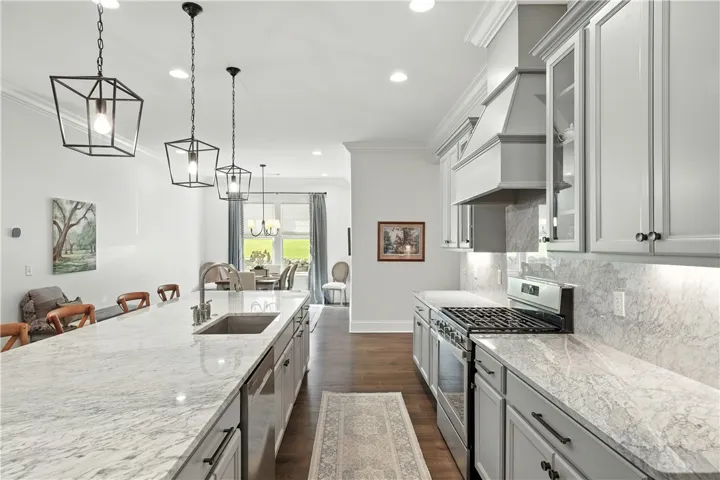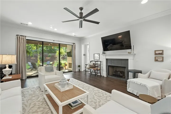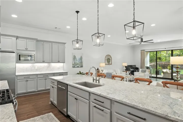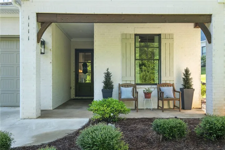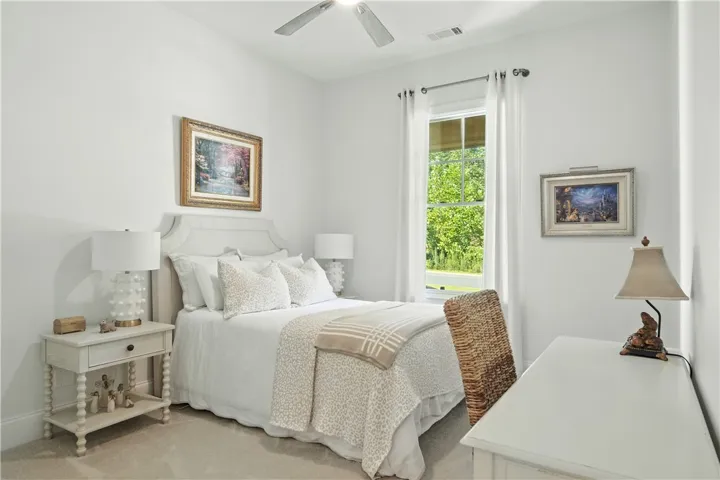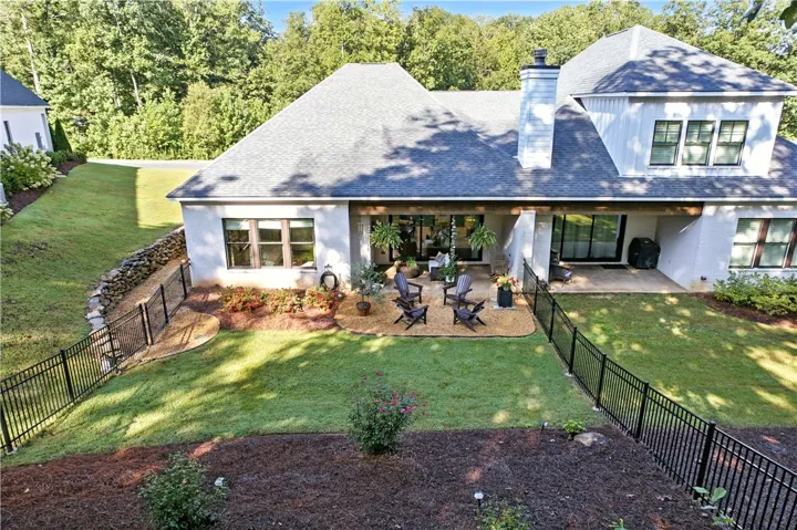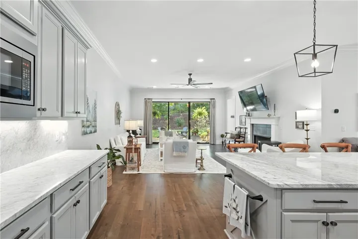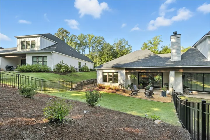 This spacious single-level twin home offers a thoughtfully designed layout with soaring 10-foot ceilings and abundant natural light—everything you’d expect from a residence fronting a golf course. With lawn care & exterior maintenance covered by the association, the property provides low maintenance living for the full-time resident, seasonal resident, short-term rental owner. The foyer opens to an impressive kitchen where a striking oversized island, which comfortably seats 5 and boasts functional cabinets on both sides, serves as the centerpiece. Extensive cabinetry with under-cabinet lighting and glass-front accents line the walls, & marble counters provide a gorgeous work space. A walk-in pantry provides exceptional storage. Adacent to the kitchen is a dining room with double windows, creating a sunny space to enjoy meals. A full glass door system spanning the rear wall of the great room opens the entire area to natural light and blends the interior and exterior living spaces. A gas fireplace provides a lovely architectural element, as well as ambiance. The primary bedroom is located at the rear of the home. With the golf course directly beyond the property, the room takes advantage of the privacy. Wood floors and stunning triple windows create a serene escape. The bath features a tremendous zero-entry frameless tiled shower, an elongated vanity with two sinks, an uber functional walk-in linen closet, water closet, & a generous walk-in closet. Two additional bedrooms are located at the front of the home, sharing a well-appointed bath with double sinks and a separate shower room. A powder bath serves the main living areas, while a charming drop zone and expansive laundry room—with built-in cabinetry, under-mount sink, & extra storage—provide everyday convenience. The outdoor living is exceptional, with a covered porch featuring a second fireplace, a fenced lawn ideal for gardening or play; and just beyond the fence is the 6th fairway of the AU Club.