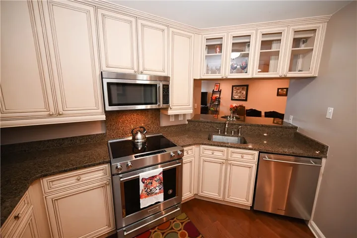 Incredible location: right at Toomer’s corner! Enjoy low maintenance living in the HEART of downtown Auburn. The ideal game day property! Upscale finishes, including hardwoods throughout – NO CARPET! Plantation shutters on all windows. Upgraded kitchen with granite countertops, gorgeous cabinetry, walk-in pantry, & new stainless appliances. Wet bar with built-in wine rack & ice maker off of the kitchen. Spacious living/dining combo allows for open concept living. Large primary suite includes private bathroom with upgraded tiled step-in shower & double vanity. Bedroom 2 also offers full en-suite bath with hallway access. Walk-in closets! Laundry facilities are provided for each floor & are only a few steps away from this unit! Beat the waiting list for downtown parking spaces – one space included in COA dues + a SECOND transferable leased spot for $100 a month (optional)! Keyed elevator access for privacy & security.