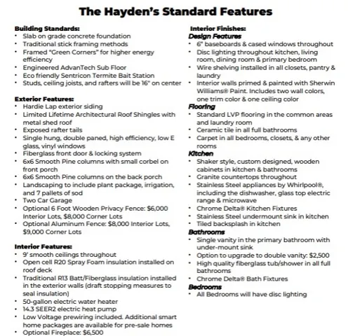 Pre-sale on Lot 68! Choose your selections! 6 month build-time. The Hayden is three bedrooms, two bathrooms and spans across 1411 square feet. When you enter into the home, the foyer leads into the laundry room and access to the two car garage. The home flows into the open concept dining and kitchen area that features a large center island, a spacious pantry and floor to ceiling windows. The kitchen opens into the living room that overlooks the back covered porch. The primary bedroom rests on the back of the home and features a spacious walk-in closet and bathroom. The second and third bedrooms are on the front of the home and share a hall bathroom. Phase 1 amenities include a dog run and fire pit area. Pool, pavilion, and pickleball court to be amenities in a future phase.