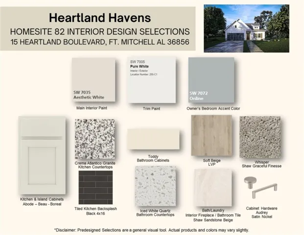 Discover Heartland Havens, where modern living meets Southern Charm in Fort Mitchell, Alabama. This vibrant, newly developed community offers a peaceful escape! A Hughston Community. Welcome to our Benton Floorplan with 1828 SF of Open Living Space. This Single-Story plan features an entry Foyer, Spacious Family Room with Fireplace, Large Kitchen & Dining Area, 3 Bedrooms, 2 Baths, 2 Car Garage, & Our Signature Gameday Patio, Perfect for Outdoor Entertaining! Our Benton E Floorplan is an Open Concept with a Modern Flare! Cheerful & Bright Entry Foyer, Spacious Great Room with Trey Ceilings & Wood Burning Fireplace, Open Kitchen w/ Tons of Stylish Cabinetry, Granite Countertops, Tiled Backsplash & Stainless Appliances. Large Kitchen Island open to the Quaint Dining Area, Walk-in Pantry for Additional Storage. Owner’s Entry Boasts our Signature Drop Zone as the Perfect Catch-all. Split Bedroom plan offers a Large Owner’s Suite conveniently tucked off the Great Room. The Owner’s Suite offers tons of Natural Lighting and tray ceilings. Owner’s Bath with Garden Tub, Tiled Shower & Spacious Walk-in Closet. Additional Bedrooms are Light Filled with Ample Closet Space. Two Car Garage & Our Signature Gameday Patio Perfect for Outdoor Entertaining! Enjoy our Luxury Flooring throughout the Main Living areas & Tons of Hughston Homes Included Features. Elevate your lifestyle with Home Automation, Keyless Entry, Video Doorbell, Automated Front Porch Light, and more!