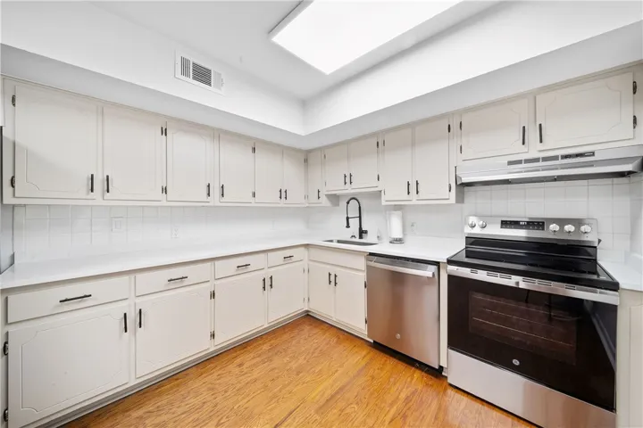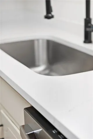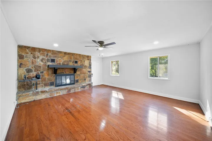 Step inside to discover a living room with hardwood and tile flooring, a cozy den with a wood-burning fireplace framed by a stone accent wall, and a bright kitchen featuring a breakfast area, brand-new quartz countertops, freshly painted cabinets, and new appliances. The main level includes the primary bedroom with hardwood floors plus a secondary bedroom, offering convenience and flexibility for guests, home office, or family.
