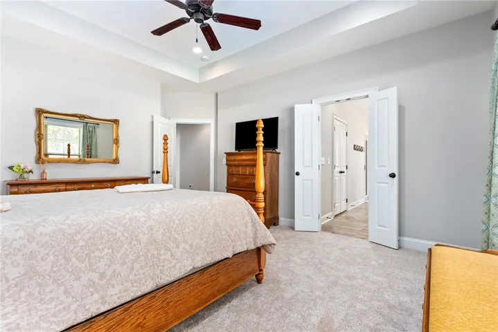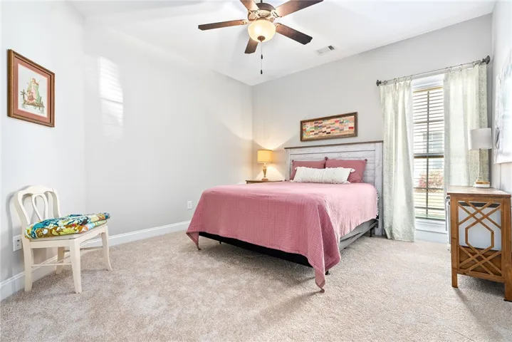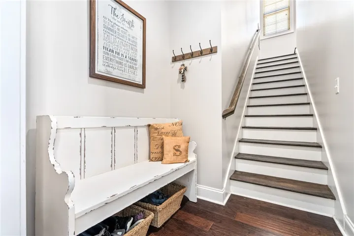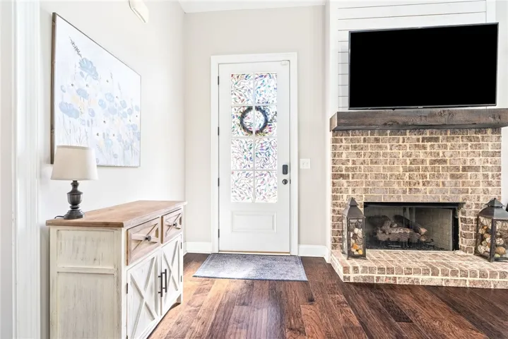 This stunning Druray Plan by Holland Homes combines timeless cottage-style architecture with modern comfort and thoughtful upgrades throughout. Featuring an open floor plan and 4 spacious bedrooms, this home is designed for both style and functionality. Step inside to a bright, inviting living space with hardwood floors, a gas log fireplace, and a vaulted ceiling that flows seamlessly into the dining area. The kitchen is a true highlight, offering a large center island, granite countertops, tile backsplash, stainless steel appliances, a double oven range (March 2025), built-in microwave, and a walk-in pantry with a sliding barn door. The refrigerator stays with the home. The primary suite on the main level boasts a spacious walk-in closet and a luxurious ensuite with a soaking tub, separate shower, and dual vanities. Upstairs, additional bedrooms provide great closet space and a guest bath with updated tile (December 2023). Enjoy relaxing mornings or cozy evenings on the covered rear porch, with a fenced backyard offering extra outdoor living space. The attached two-car garage, attic storage, and dedicated laundry room provide everyday convenience. Located in the sought-after The Meadows at Highlands! This neighborhood offers a low-maintenance lifestyle with HOA services that include: Lawn mowing & edging, Flower bed maintenance, pine straw, fertilizer & weed control. This home has been beautifully maintained and upgraded, including: Roof replaced April 2022, New carpet in bedrooms October 2025, Interior paint touch-ups for a fresh feel, Extended patio (2025) — perfect for entertaining, Fenced yard for privacy and pets, Irrigation system to keep the lawn lush, Alarm system for added peace of mind.