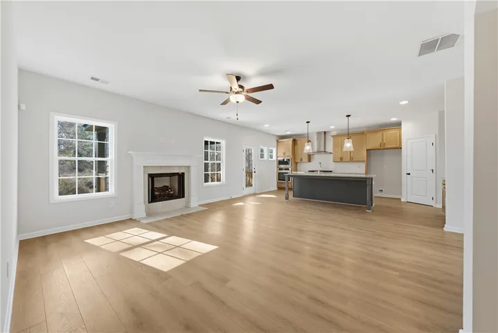 Welcome to The Landings at Academy Drive, a Hughston Homes community offering thoughtfully designed homes with exceptional finishes and features. Presenting the Cannaberra B plan, offering 2,864 sq. ft. of elegantly appointed living space, 5 bedrooms, 3 full baths, a two-car garage, and our signature Gameday Patio, perfect for outdoor entertaining! Step inside to a welcoming foyer, formal dining room featuring beautiful, coffered ceilings and classic wainscoting. The spacious great room is centered around a cozy gas fireplace and flows seamlessly into the gourmet kitchen, complete with custom cabinetry, recessed lighting, granite countertops, designer tile backsplash, walk-in pantry, and stainless-steel built-in appliances, a gas cooktop, and a stylish vent hood. The spacious center island serves as the heart of the kitchen, featuring a built-in sink and integrated dishwasher, offering both convenience and functionality in the open-concept layout. Main level includes a private guest bedroom and full bath, ideal for guests, playroom or office. Just off the garage entry, you’ll find our signature drop zone with built-in cubbies, perfect for keeping your home organized. Upstairs, the expansive owner’s suite featuring vaulted ceiling and a ceiling fan, with tons of natural light. The spa-inspired bath includes a tiled shower, relaxing garden tub, dual quartz vanities, and a spacious walk-in closet. Upstairs, easy access to the centrally located laundry area and three additional bedrooms offer generous closet space and share a full hall bath and linen closet. Enjoy luxury vinyl plank flooring in main living areas on main level. Enjoy year-round outdoor living on the Gameday wooden patio with wood-burning fireplace, ceiling fan, and built-in speakers, an entertainer’s dream! This home includes spray foam insulation, zoned irrigation, gas tankless water heater, 2” blinds on front windows, and smart home technology. A perfect blend of comfort, style, and efficiency.