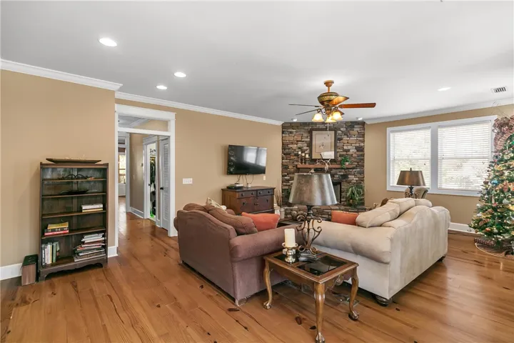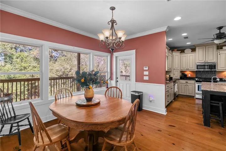 The home itself welcomes you with abundant natural light and beautiful pine floors. The main level features a lovely family room with a gas/wood-burning fireplace. On the main level, you’ll find a convenient laundry area and a guest room with a full bathroom. The primary suite offers direct access to a screened porch, a spacious walk-in closet, and an en-suite bathroom with a jetted tub and separate shower. The kitchen, located on the main level, is bright and inviting with an eat-in area, an island, two ovens (one of which is a convection/baking oven), and a large walk-in pantry.