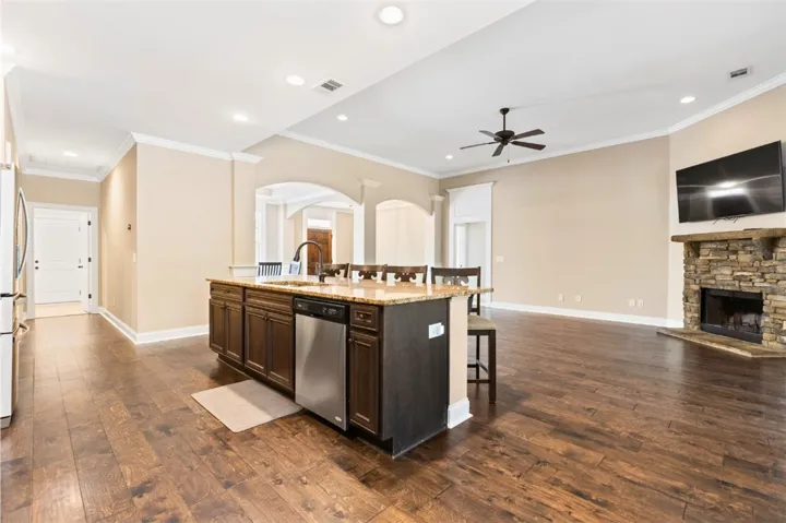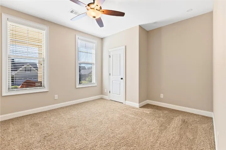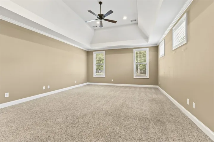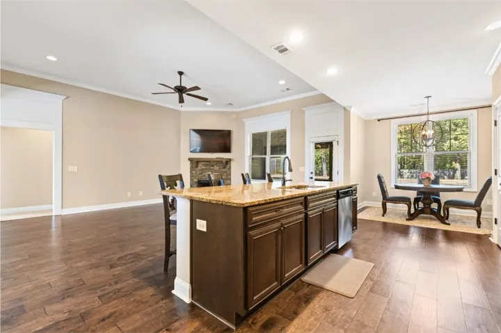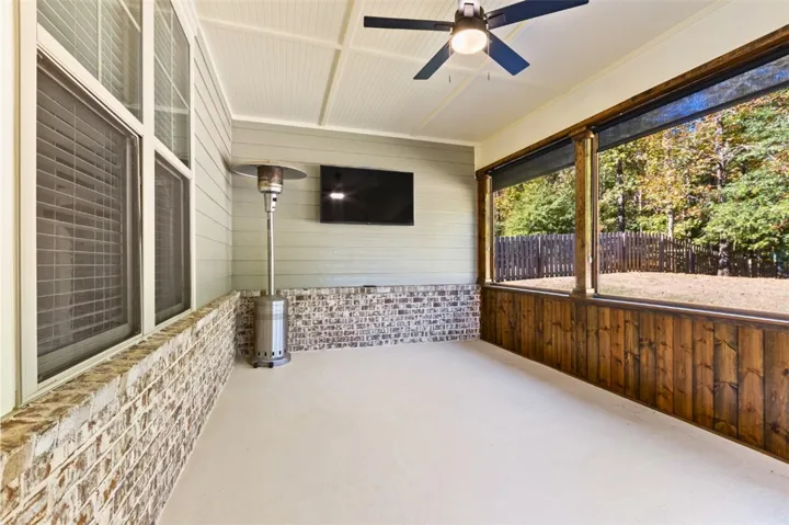 This 4-bed, 2.5-bath residence blends an open layout with classic touches: a formal dining room with a coffered ceiling, a breakfast room, and a chef-friendly kitchen anchored by a large island and walk-in pantry. High ceilings carry throughout, keeping everything bright and airy. The generous primary suite features a soaring ceiling, two spacious closets, and a spa-style shower with built-in seating and a garden tub. Everyday living is a breeze thanks to the mud room with bench and the laundry room located just inside the home by the door of the insulated two-car garage. Recent updates make it move-in ready: the interior and front porch were freshly repainted, and the custom screened-in porch was newly stained—perfect for morning coffee or game-day evenings. Outside, a fenced backyard backs to wooded views for privacy and play.