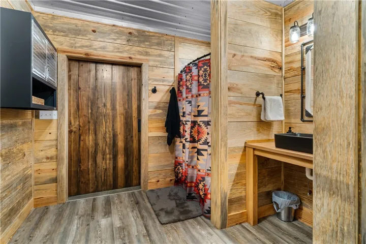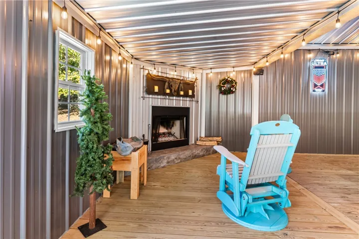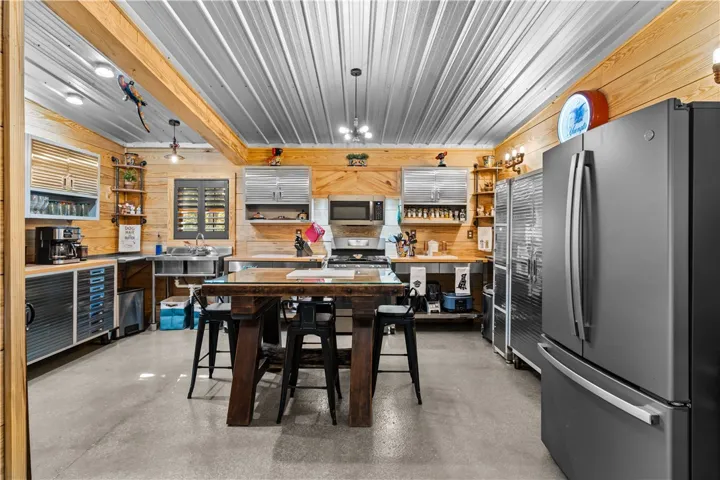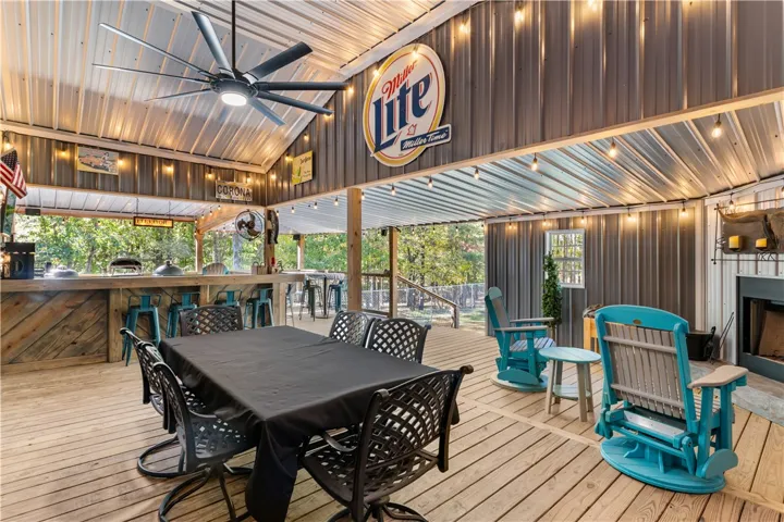 The main building, would make a great gathering space for entertaining guests and family and friends. It features a large open concept with high ceiling, wooden interior wall accents, a kitchenette, plenty of storage space in the form of closets, additional rooms, and a bathroom. It features a commercial size bar, complete with covered outdoor sitting space to entertain many guests.