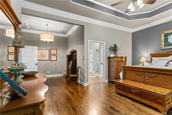 The primary suite features a beautiful tray ceiling, a spacious bath, and private access to a peaceful screened porch.