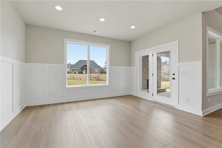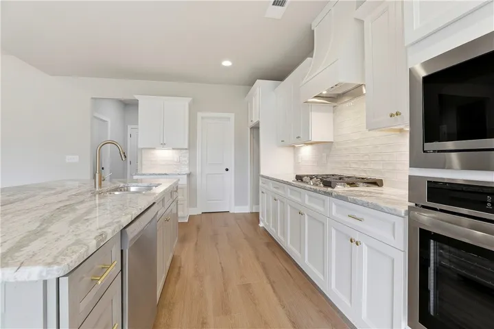 Davis – 4 bedroom / 3 Bath – Primary plus one bedroom on main. Large foyer welcomes you into the home with hidden u-shaped stairway. Vaulted ceiling in great room with wood-burning fireplace. Beautiful kitchen with center island, solid-surface countertops, wall oven, walk-in pantry and over-sized breakfast dining area. Mudroom and laundry off kitchen and garage entryway that makes for a great drop zone. Primary bedroom with two vanities and walk-in shower. Upstairs has two bedrooms, each with walk-in closets, and hall bathroom. Covered back patio with fireplace. Ask about our Builder Incentives!