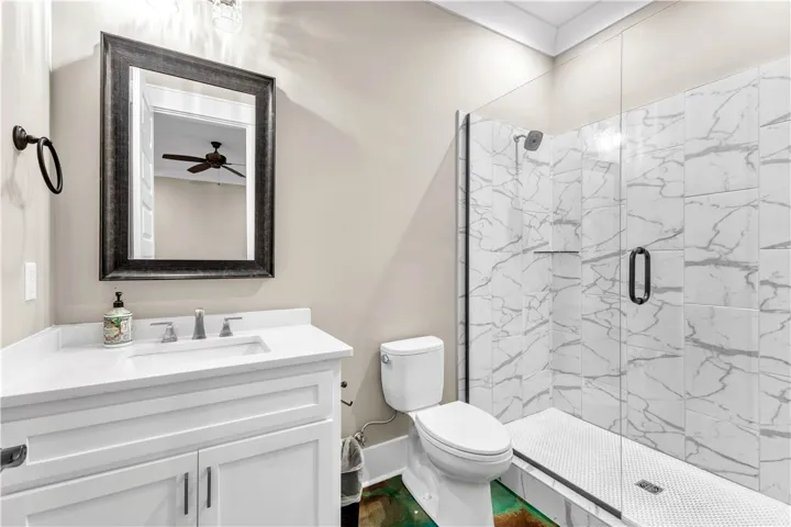 On the third level, an additional guest bedroom and bath await, featuring double vanity sinks, a walk-in shower, and four full-sized built-in beds with TVs and storage, perfect for accommodating extra guests during weekend visits.