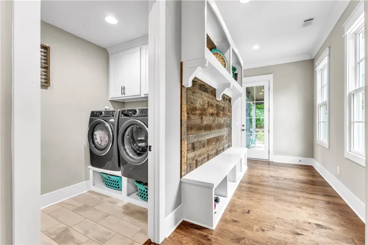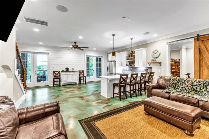 The terrace level features three large bedrooms, two with stunning lake views, each equipped with walk-in closets and ensuite baths that include tiled showers with rain heads and dual vanities. This home is well-suited for full-time living, complete with a designated office workspace and an in-home gym. The spacious den area offers a kitchenette and entertainment space, and double doors lead you outside to bask in sunshine and enjoy lakeside activities on the expansive dock, which includes a boat lift and cement steps leading to a private lake inlet.