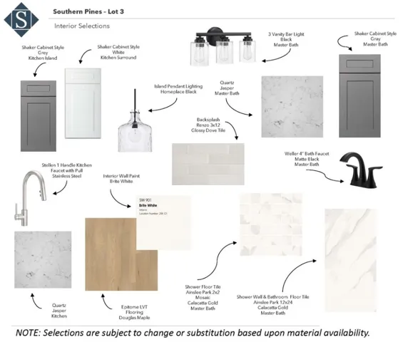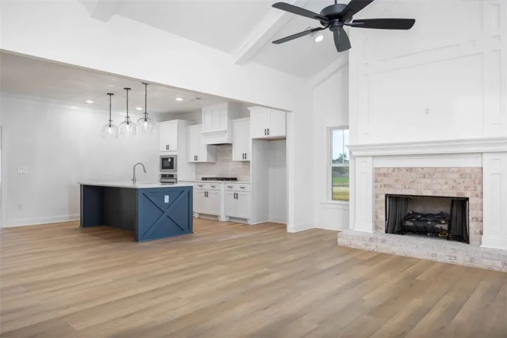 This home offers a crisp, modern feel with a layout that keeps everything open, bright, and functional. The heart of the home is the kitchen, featuring a charcoal-blue island with X-panel detailing, white quartz countertops, shaker cabinetry, clear glass pendants, and a subway tile backsplash. The kitchen blends effortlessly into a generous living area wrapped in natural light and centered by a tall, custom-trimmed fireplace with a soft-washed brick surround. Wide-plank flooring brings warmth throughout the main spaces and ties the entire design together.