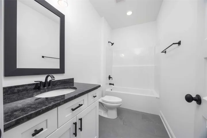 Secondary bedrooms are well-sized with fresh carpet, and the additional baths continue the home’s clean, neutral palette with stone-look tile and dark hardware. A dedicated laundry room with tile flooring adds convenience and functionality.