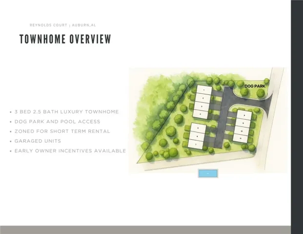 Welcome to Reynolds Court, the newest development by Frank Norment Homes — a rare opportunity to own a luxury townhome offering highly coveted short-term rental zoning — making them an ideal fit for savvy investors and first-time buyers alike. These stylish, garage-equipped units are perfectly positioned within Auburn for easy access to campus and 280. Neighborhood amenities include a pool and a fenced dog park.