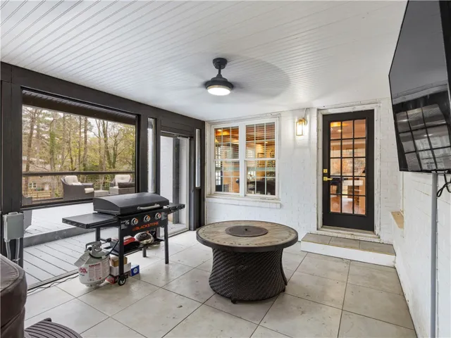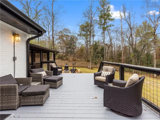 Outdoor living is elevated with a COVERED PORCH and an UPPER DECK THAT SPANS THE ENTIRE WIDTH OF THE HOME, perfect for relaxing or entertaining. The backyard also includes a STONE PATIO and OUTDOOR FIREPLACE, creating an inviting retreat year-round.