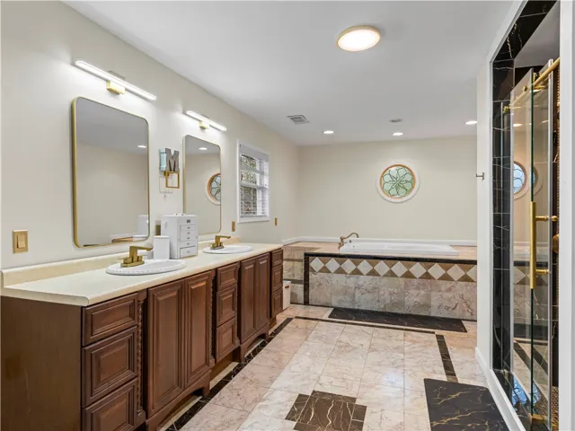The MAIN-LEVEL SUITE showcases a SPA-LIKE BATHROOM featuring a WALK-THROUGH SHOWER, GARDEN TUB, TWO SHOWER HEADS, a SAUNA, and an ENORMOUS CUSTOM CLOSET.