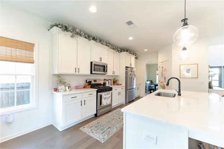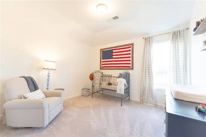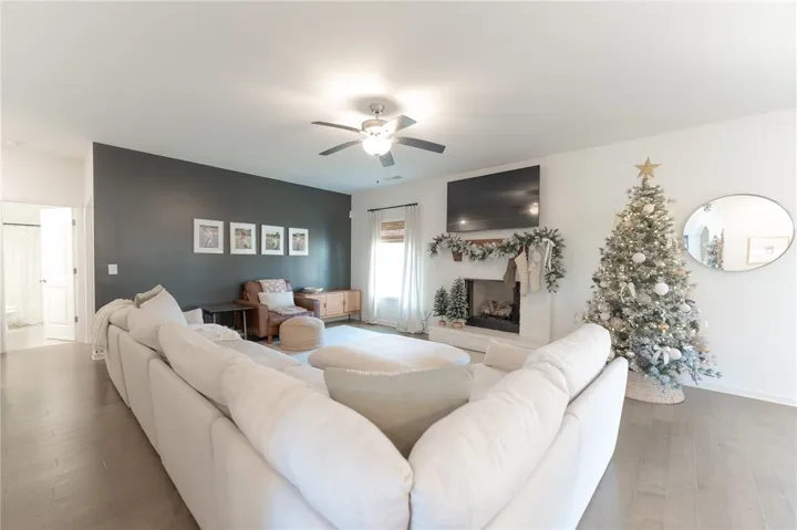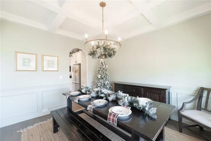 Built with energy-efficient materials and smart home technology — including keyless entry — the layout supports both everyday living and entertaining. The kitchen includes a large island, walk-in pantry, stainless steel appliances, and a breakfast area. Adjacent is a formal dining room with coffered ceilings and wainscoting, and a spacious great room with a gas fireplace.