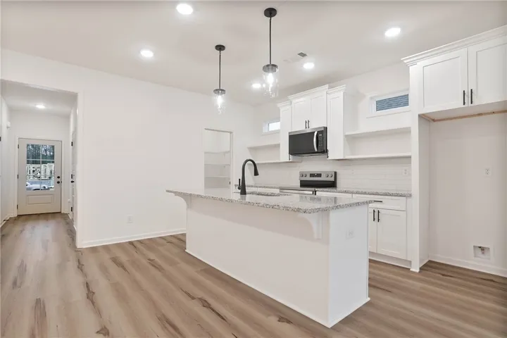MOVE IN READY- The Toby B floor plan is a beautiful 3 bedroom, 2 bath home, at 1391sq ft and includes a single car garage. The entry porch opens up into a foyer with access on one side to the linen closet and two guest bedrooms with a shared full bathroom. In the foyer, you also have access to the garage and laundry room. From the foyer, you enter into the open concept kitchen, living, and dining areas. The kitchen features a large island with plenty of cabinet space & floating shelves. Through the kitchen we find the living room filled with natural light from the large windows. The Owner’s Retreat sits at the back of the home and features a private en-suite with a walk in tile shower, and a large walk in closet. This Toby plan will feature an 11×7 concrete pad for your back patio.