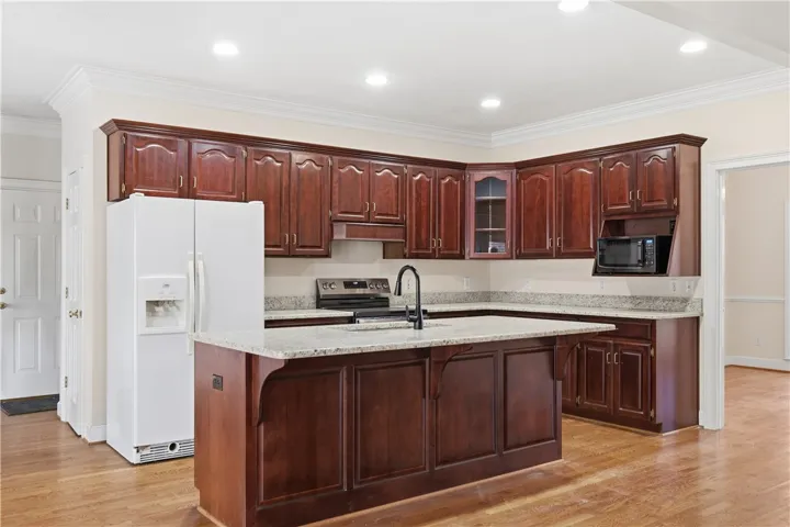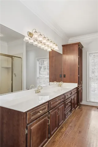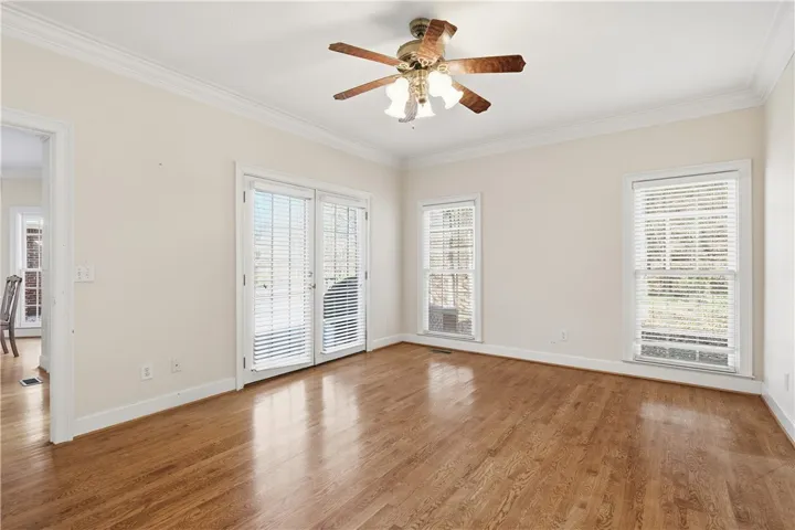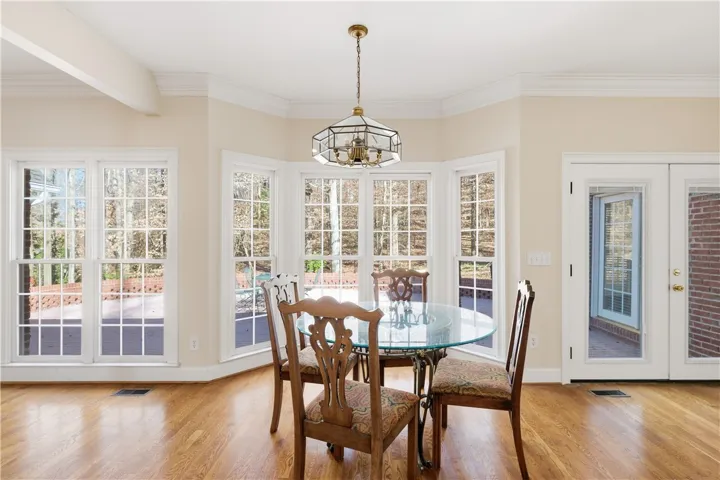 This all-brick home offers a timeless exterior and thoughtfully designed bright and airy rooms, complemented by 2-inch hardwood floors that run throughout the main living areas, creating warmth and continuity. Major updates including a brand-new roof and HVAC system. A long, private driveway leads to the home, perfectly tucked among mature hardwood trees, offering both shade and a sense of seclusion. The welcoming front porch opens into a gracious foyer, flanked by a study and formal dining room—both highlighted by expansive windows that flood the home with natural light. The family room serves as the heart of the home, featuring a cozy gas fireplace and a built-in bookcase that adds both character and functionality. The kitchen has been refreshed with newly installed countertops and a new stove, offering ample workspace for cooking and entertaining. A charming bay window provides the perfect nook for a breakfast table, with peaceful views overlooking the brick patio and wooded backyard. Multiple sets of double doors open to the outdoor living area, seamlessly connecting indoor and outdoor spaces and creating an ideal setting for entertaining, relaxing, or enjoying the privacy of the surrounding trees. The main-level primary suite offers generous space, a large ensuite bathroom, and a walk-in closet. Two additional bedrooms on the main level share a well-appointed Jack-and-Jill bathroom. A conveniently located half bath is perfect for guests, while the oversized laundry room provides excellent storage and everyday practicality. Upstairs, the home continues to impress with a spacious fourth bedroom, two versatile bonus rooms and newly added full bathroom. The walk-out attic offers easy access to mechanical systems. Ideally situated near I-85 interstate access, Tiger Town, Moores Mill, shops and restaurants. This home combines classic charm, modern updates, and a prime location—making it an exceptional opportunity for comfortable living and effortless entertaining.