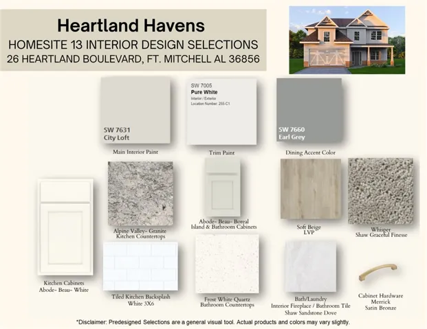 Discover Heartland Havens in beautiful Fort Mitchell, Alabama, a vibrant new community by Hughston Homes that offers peaceful surroundings and a true sense of home. Enjoy modern comfort in a setting designed for relaxation, connection, and everyday convenience. Welcome to our Camden B Floorplan, featuring 2,599 sq. ft. of stylish living space with 4 bedrooms and 2.5 baths. Step into the inviting foyer, featuring soaring two-story ceilings and a formal dining room that showcases a coffered ceiling and elegant trim details. The spacious great room centers around a cozy wood-burning fireplace, creating a perfect spot for gatherings and quiet evenings alike. The chef’s kitchen impresses with granite countertops, beautifully tiled backsplash, and stainless-steel appliances, including an electric range. A large center island with seating overlooks the breakfast area, ideal for casual dining or entertaining. The walk-in pantry (or optional butler’s pantry) provides abundant storage for every culinary need. Convenience meets organization with the Signature Drop Zone, complete with built-in cubbies, while the laundry room and half bath are tucked neatly on the main level. Upstairs, retreat to your expansive owner’s suite with a sitting area and a luxurious bath featuring a garden tub, separate shower, dual vanities, and a large walk-in closet. Three additional bedrooms offer generous space and natural light, along with a full bath nearby. Enjoy luxury vinyl plank flooring, a two-car garage, and our Signature Gameday Patio, featuring a wood-burning fireplace, ceiling fan, and outdoor speakers, perfect for relaxing or entertaining outdoors. 2-car side entry garage. Elevate your lifestyle with included home automation, and experience the warmth of community living in Heartland Havens, where every day feels like home.