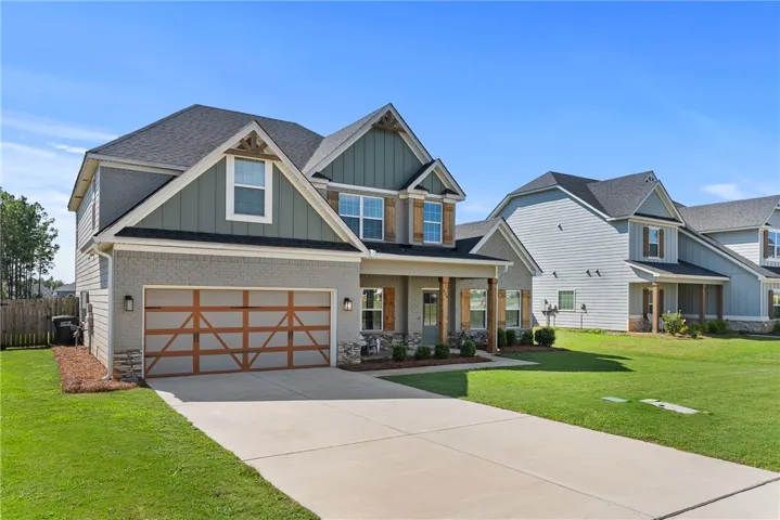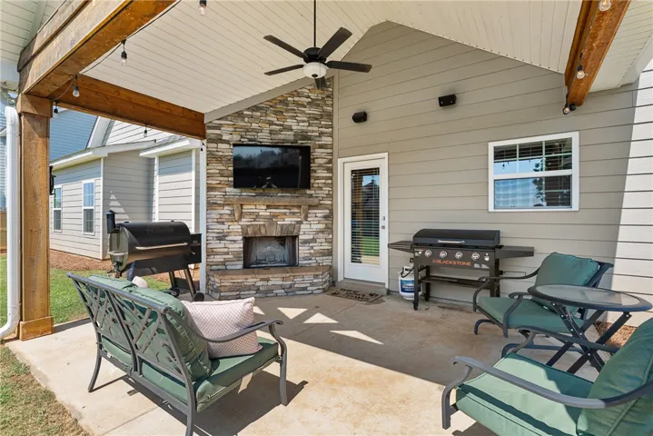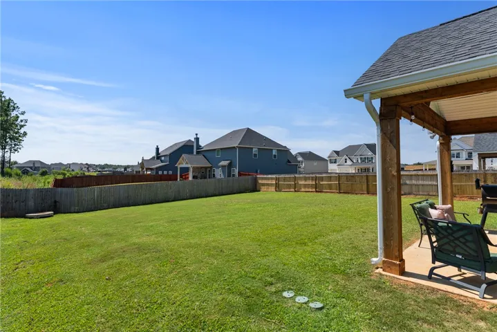 Upstairs, you’ll find three additional bedrooms, two full bathrooms, and a large bonus room—ideal for a playroom or workspace. Step outside to a covered back porch with a wood-burning fireplace overlooking the fenced backyard, already finished and ready to enjoy.