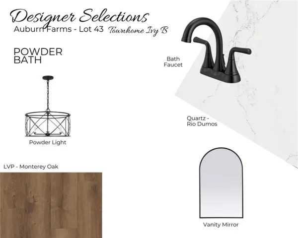 Welcome to Auburn Farms! The Ivy B is a thoughtfully designed two-story floor plan offering a functional layout with the primary suite conveniently located on the main level. The first floor features an open-concept living space where the great room flows seamlessly into the dining area and kitchen, complete with a large center island and easy access to the covered porch—ideal for everyday living and entertaining. The private primary suite includes a spacious walk-in closet and ensuite bath with an optional double-vanity upgrade. Additional main-level highlights include a powder room, dedicated laundry area, foyer entry, and direct access to the garage.