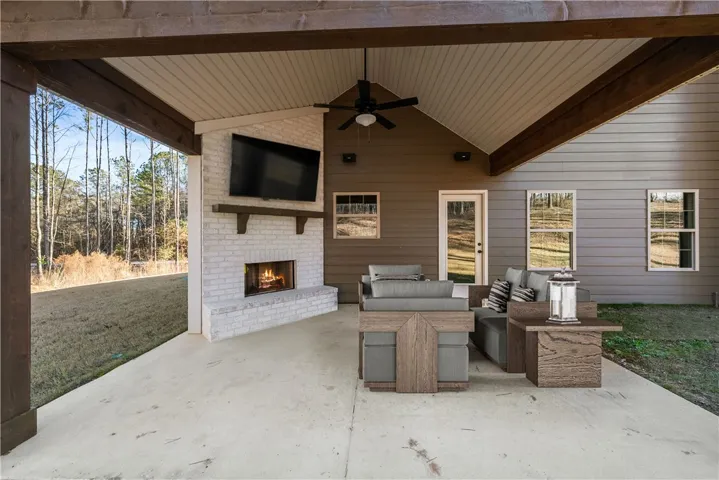 ** Gameday Patio with outdoor fireplace, ideal for hosting year-round