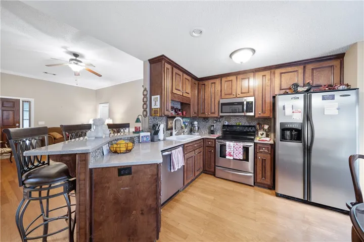 Welcome to 800 Waverly Place in Waverly Park! This beautifully maintained one-level 3 bedroom, 2 bathroom home offers a fantastic layout. Step inside to a spacious living room featuring wood floors, crown molding, and a ceiling fan, creating a warm and inviting atmosphere. The eat-in kitchen is well-appointed with updated quartz countertops, tile backsplash, a pantry, and all appliances included. The primary suite is a relaxing retreat with tray ceilings and a ceiling fan, while the en suite bath boasts a double vanity, garden tub, tile shower with a seat, and a large walk-in closet. Bedroom 2 is generously sized with a ceiling fan, and Bedroom 3 also includes a ceiling fan for added comfort. Laundry Room with a Cabinet. Enjoy outdoor living with a back patio overlooking the fenced backyard. Additional features include a side-entry garage with a storage room for extra space and convenience, gutters, and storm doors.