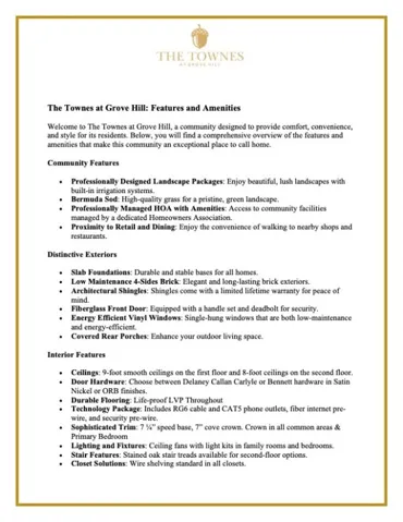 The Townes at Grove Hill is Dilworth Development, Inc’s highly anticipated new community! Serene setting in sought after Grove Hill! Townhomes showcase a gracious open living floor plan & large island setting the perfect space for entertaining or everyday living. Large primary en-suite with double vanities and walk-in shower. Home will feature solid surface countertops throughout & stainless appl. Located close to Auburn University, Tiger Town, Shopping & Dining. INTERIOR unit with single car garage and Oversized covered back porch. Community Club house, two pools, playground, sidewalks through out and The Lake Wilmore Park Recreation Center ~ a brand-new facility featuring a fitness center, indoor track, basketball courts, pickleball courts and pool!