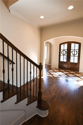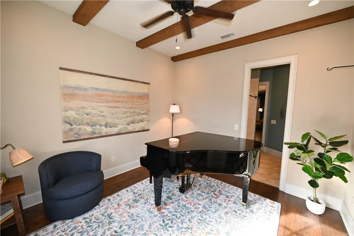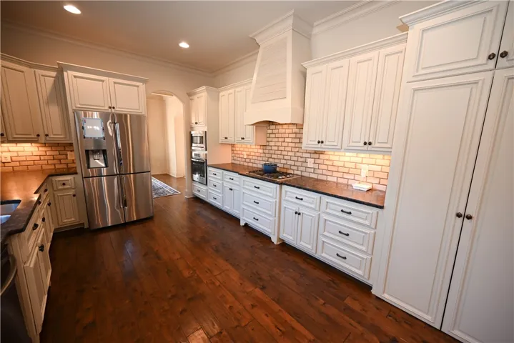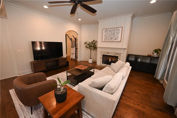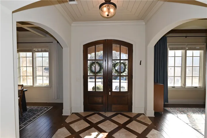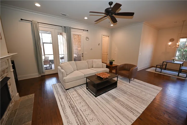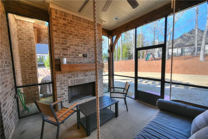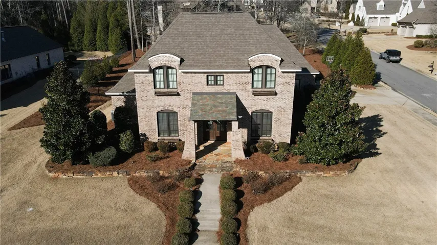 Nestled onto a generous corner lot in one Auburn’s most desirable neighborhoods, this showcase home offers a fantastic floorplan w/ exquisite attention to detail. Flagstone steps lead to a covered portico w/ arched double wooden doors, lending an elegant yet rustic French-country aesthetic. Inside, a grand foyer w/ inlaid tile floor & vaulted wood ceiling is flanked by formal living & dining rooms, both w/ striking architectural features: exposed wooden beams in the living & a coffered ceiling w/ beaded chandelier in the dining. Beyond the dining room awaits a gourmet kitchen w/ honed natural stone countertops, tiled backsplash, undercabinet lighting, gas cook top, pristine white cabinetry w/ matching custom range hood, & a recessed walk-in pantry! A lovely open breakfast area – easily spacious enough for a full-size table – unites the kitchen & great room into a seamless living space w/ functional flow. In the great room, a gas fireplace creates a cozy, inviting atmosphere, a vibe echoed by the woodburning fireplace on the adjacent screened porch. Private & relaxing, the primary retreat is located on the main level & boasts an elevated ceiling, hardwood floors, & large walk-in closet. Its luxurious en-suite includes double sinks, soaking tub, extended tile/glass shower, & water closet. There is a second full bath on the main level, as well as a spacious laundry w/ cabinetry & sink, a drop zone w/ built-in bench, & the side-entry double garage. Upstairs are three additional bedrooms – one is a suite with private bath while the other two share a Jack & Jill bath featuring a separate vanity area w/ double sinks & tons of storage. The delightful fenced backyard offers ample green space bordered by a natural area w/ plenty of mature trees for privacy. Neighborhood amenities include miles of sidewalks, a gorgeous pool, clubhouse, plus multiple lakes & green areas, all within minutes of the shopping, dining, & recreation offered by the fabulous Moores Mill community!