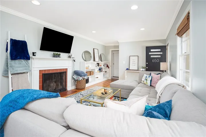 650 Auburn Drive has been thoughtfully updated while maintaining its character. The renovation opened the kitchen to create a large, light-filled living space with extensive cabinet storage, stainless steel appliances, and a substantial island with bar seating. Refinished hardwood floors run throughout the home.