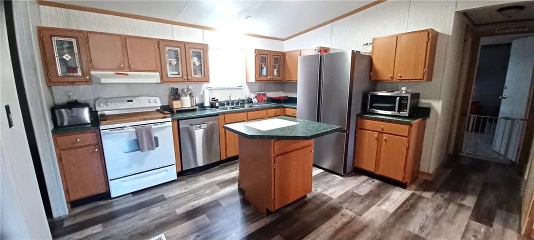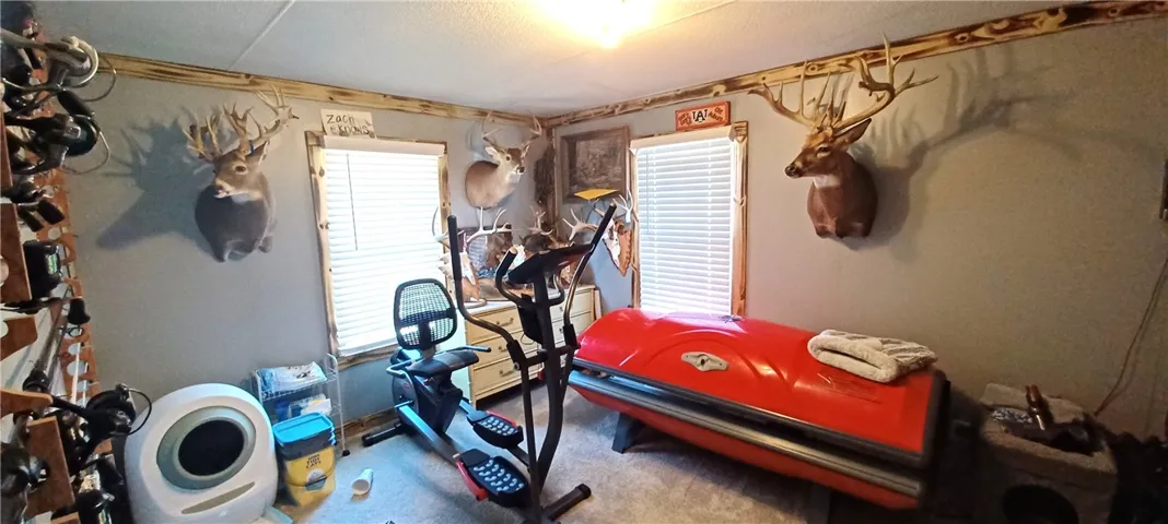 The kitchen is open to the den and includes an island, refrigerator, dishwasher, and ample cabinet and counter space. Just off the kitchen is a spacious laundry room with room for a deep freezer.