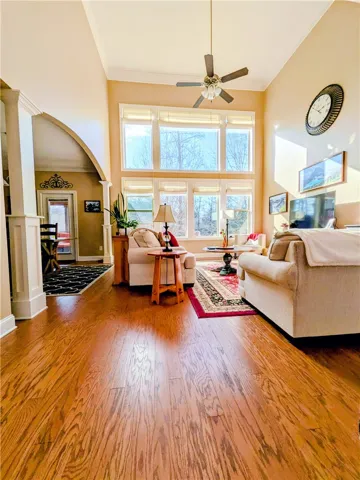 Stunning finished walkout basement home on a private, wooded cul-de-sac lot backing to a peaceful creek. The outdoor living space is exceptional, featuring a screened deck on the main level, flagstone fire pit area, and hot tub that remains with the home. A wall of windows fills the great room with natural light and highlights the soaring 17-foot ceilings, creating an open and inviting atmosphere.