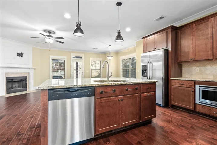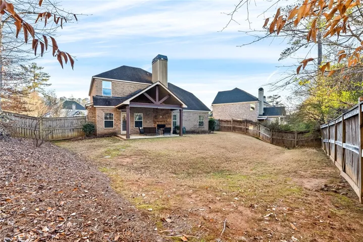 Lots of lovely details in this 4 bedroom 2.5 bath home with great outdoor living space! First floor has NO CARPET & features formal dining room with coffered ceiling & judges paneling, open kitchen/great room combo with oversized granite island & walk-in pantry, pull out shelving, stainless appliances (inc refrigerator). Downstairs Primary Bedroom has tray ceiling, lots of natural lights, 2 closets & lovely en suite bathroom with wood-look tile, 2 vanities, tiled shower & jetted tub. Second floor has three more bedrooms w large walk-in closets, vaulted ceiling w fans & full bathroom. Separate laundry room with cabinets and the washer & dryer remain! Wrought iron stair rails, irrigation sys, gutters, blinds remain. Awesome gameday covered porch has HDMI cabling above stacked stone outdoor fireplace. On cul de sac. Great location with easy access to Tiger Town shopping, schools, churches, Auburn, Opelika, and Auburn University.