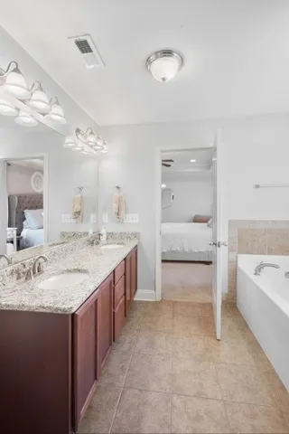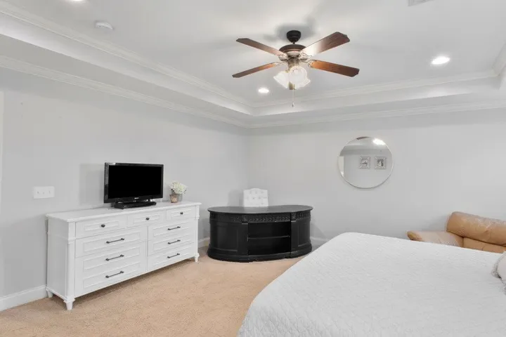 The primary suite includes a tray ceiling with crown molding, a large closet, and a private bath with a soaking tub and tiled shower. Two additional bedrooms are generously sized and share a hall bath.