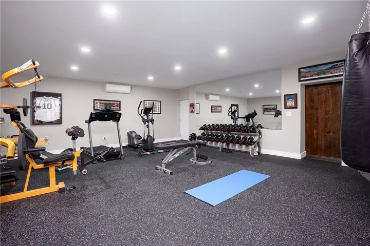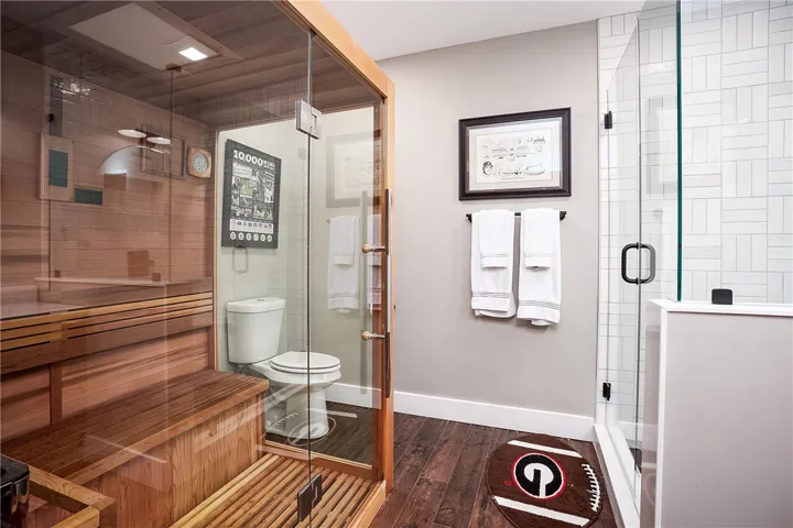 A dedicated professional level fitness studio includes shock absorbent flooring, floor to ceiling mirrors, and an adjacent full bath with built-in sauna, creating a private wellness retreat.