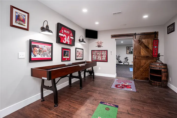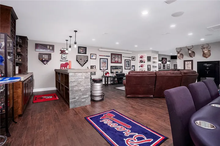 The finished walk-out basement creates the ultimate man cave and entertaining space with five mounted TVs, built-in gun safe, and custom full bar.