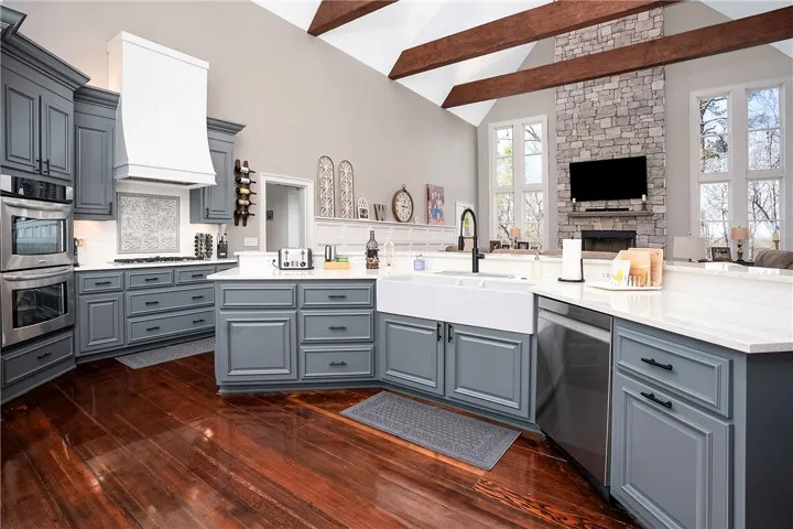Unique details include leaded and stained glass windows and doors salvaged from a turn of the century church in Cullman, Alabama, along with hardwood floors reclaimed from a 1920s gymnasium, bringing warmth and character throughout the home. The main living area features vaulted ceilings with wood accent beams and a grand fireplace, flowing into the updated chef’s kitchen and spacious gathering areas.