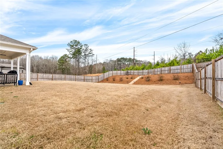 The backyard is designed to be enjoyed. A wood privacy fence with a double gate provides both privacy and convenient access. A walkway leads to a fire pit area that is perfect for relaxing in the evenings or spending time with friends and family.