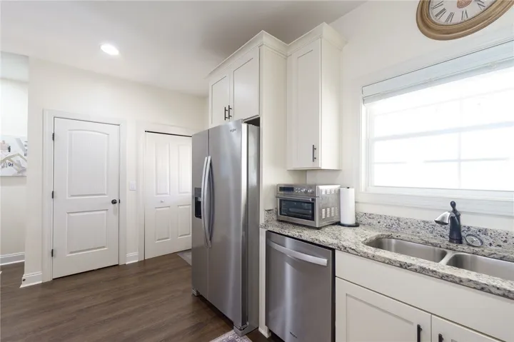 The main level features an open great room, breakfast area, and kitchen with a spacious island. The kitchen features granite countertops, stainless steel appliances along with a walk-in pantry. The laundry closet is conveniently located on the main level and includes a stack washer and dryer. Luxury vinyl plank flooring throughout the home along with a large under-stair closet.